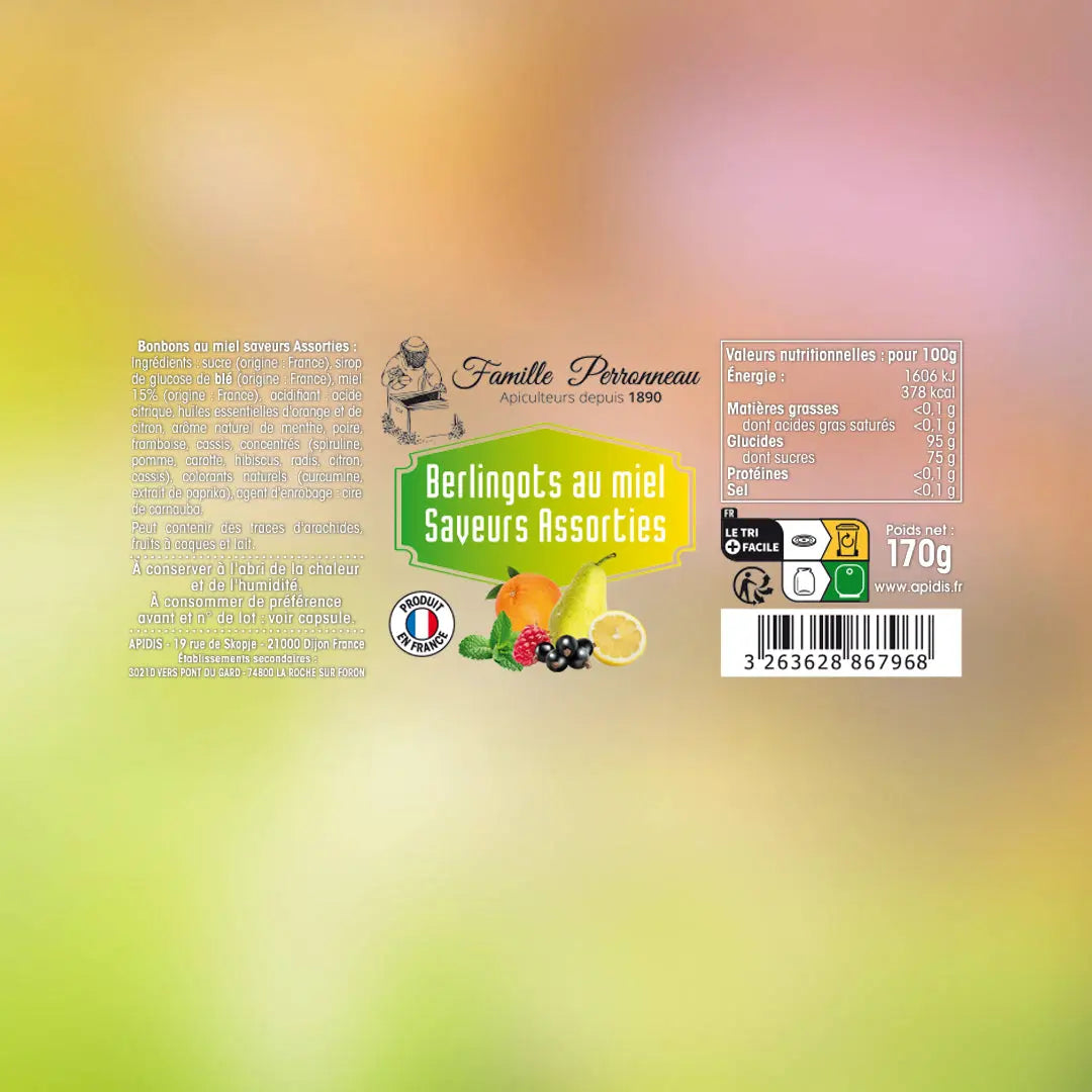 Découvrez nos berlingots fruités au miel élaborés en France de façon artisanale, par notre maitre confiseur. Un instant de nostalgie et de gourmandise avec ces traditionnelles confiseries aux arômes naturels de fruits (citron, orange, poire, framboise, cassis, menthe) associés à la douceur du miel.