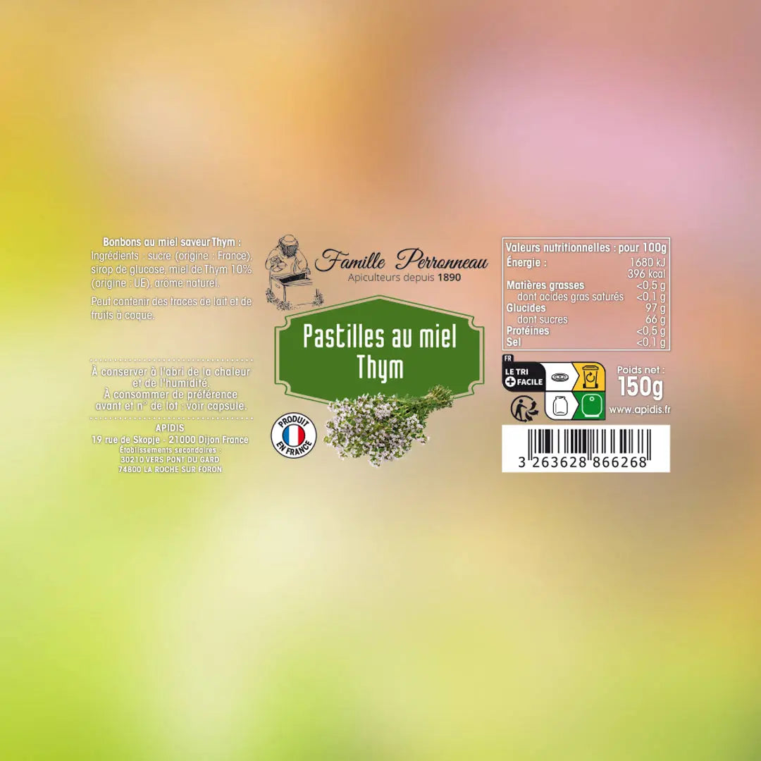 | Ingrédients | Bonbon au miel de thym forme pastille : Sucre, sirop de glucose, miel de Thym 10%, arôme naturel. |